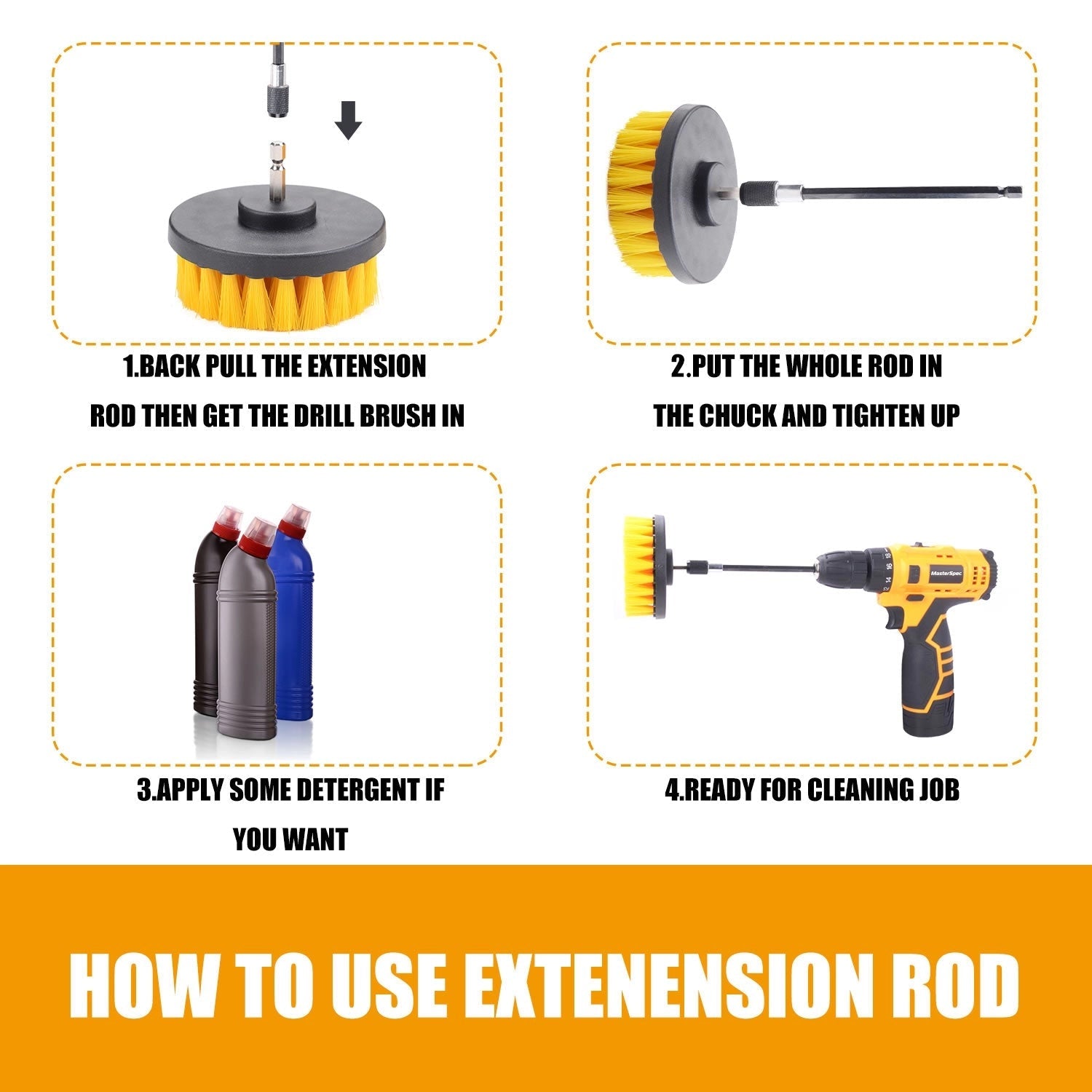 • Extension Attachment-Straight extended attachment allow you to clean the tight spaces or hard-to-reach areas such as drip pans, crevices, car wheel, inner part of toilet etc. The drill brushes can be locked tightly and made precise control.