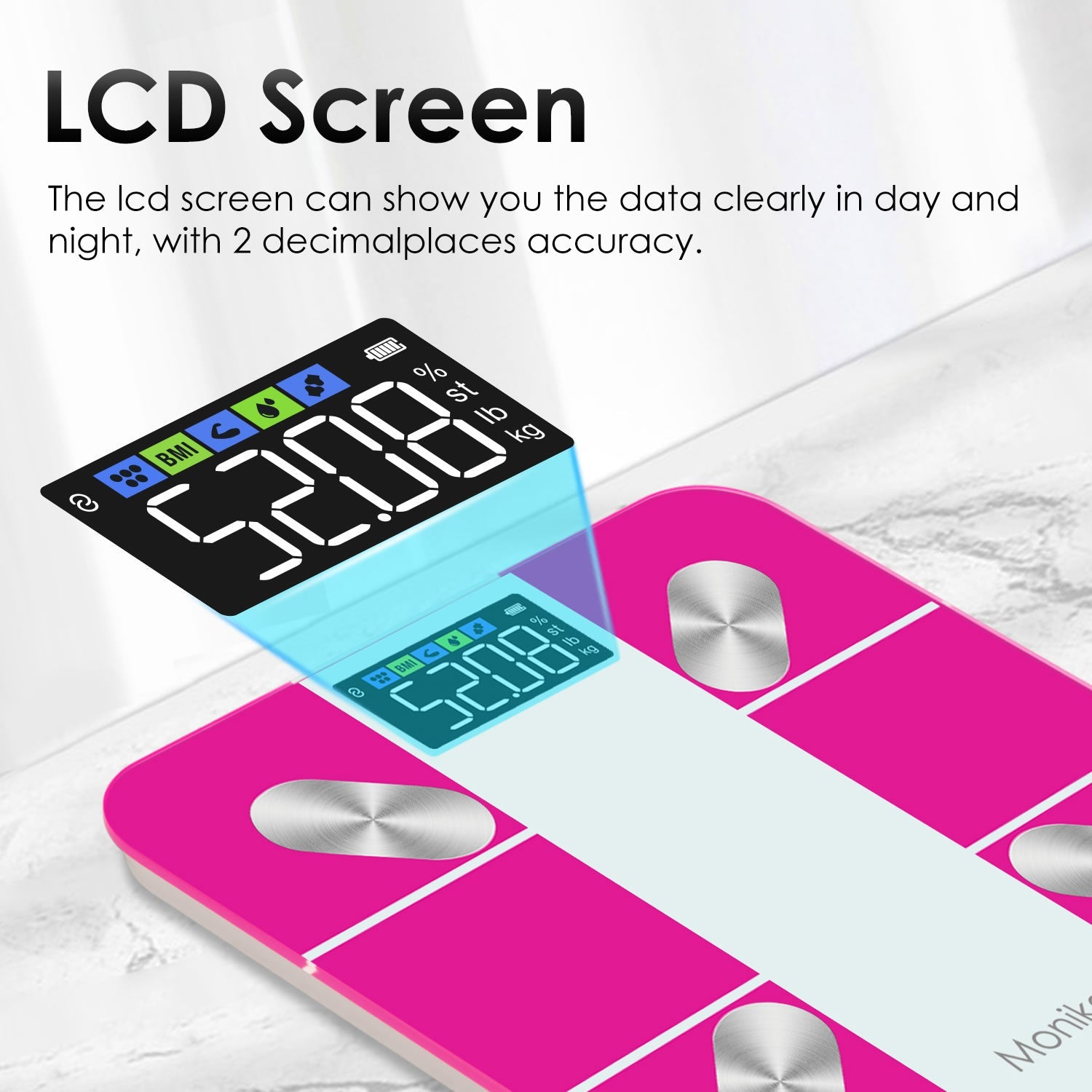 - [Highly Accurate, Fully Automatic] High precision sensors measure in increments of 50g/0.11lb with 180kg/396lbs capacity, and 4 sensitive electrodes work together to ensure Monika bathroom scale accurate and consistent body composition analysis; Just step on the weighing scale to get timely readings, no more tapping to activate the scale; Auto-connection, auto-recognition, auto ON/OFF, auto-calibration, low battery and overload indication.