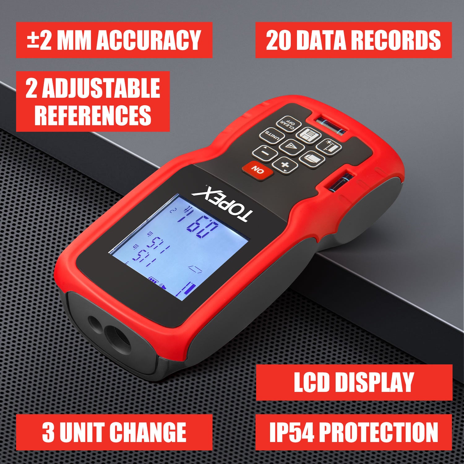 - IP54 Protection: The LCD backlit screen used in the distance meter can be used in low-light environments, and the screen can be easily brightened. It has an IP54 dust/waterproof rating, suitable for home decoration, construction, industry and other applications.
