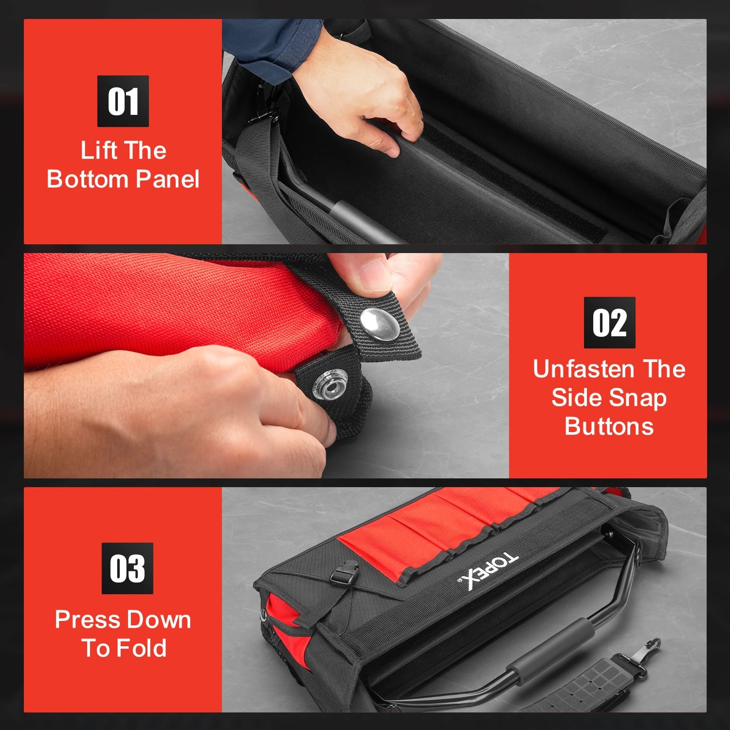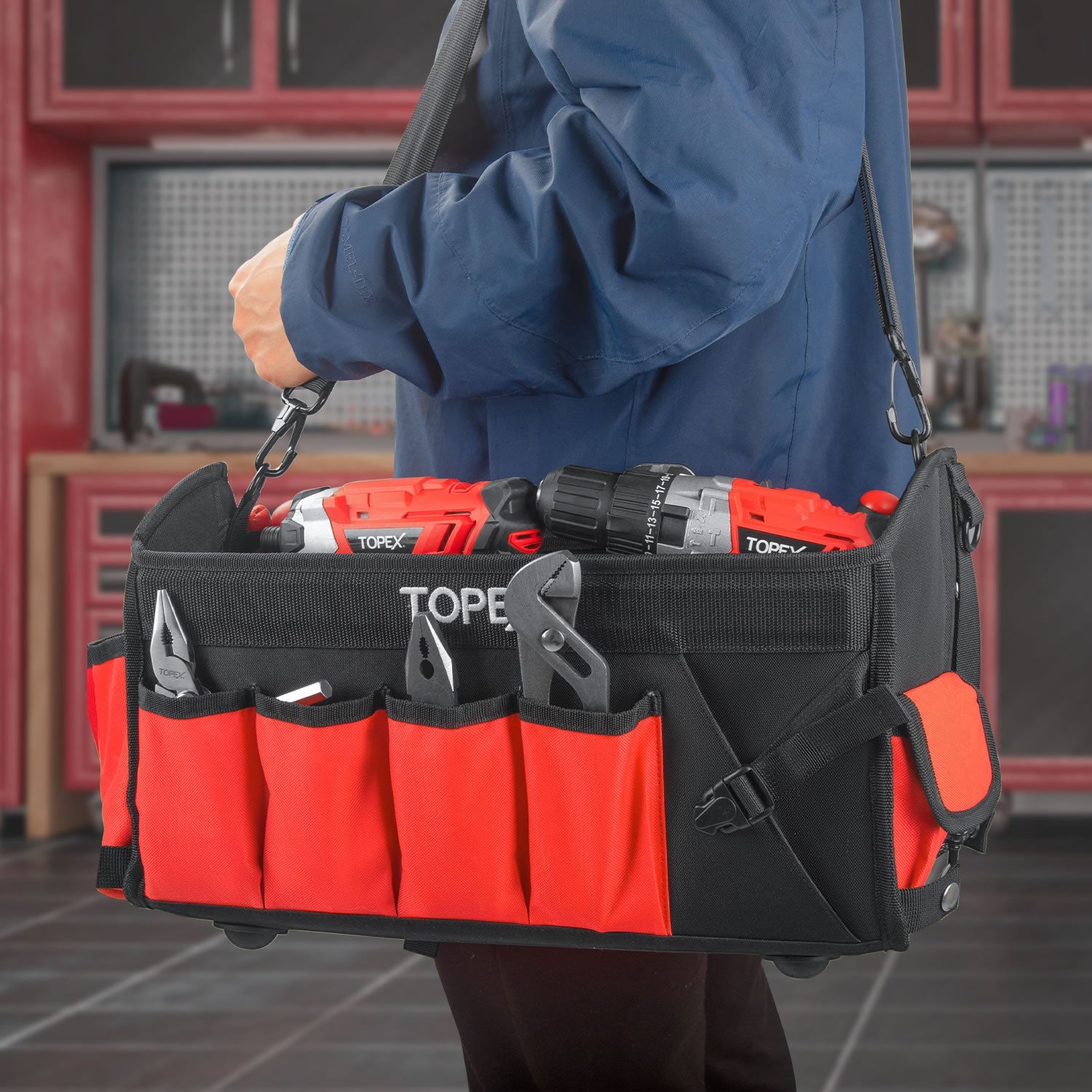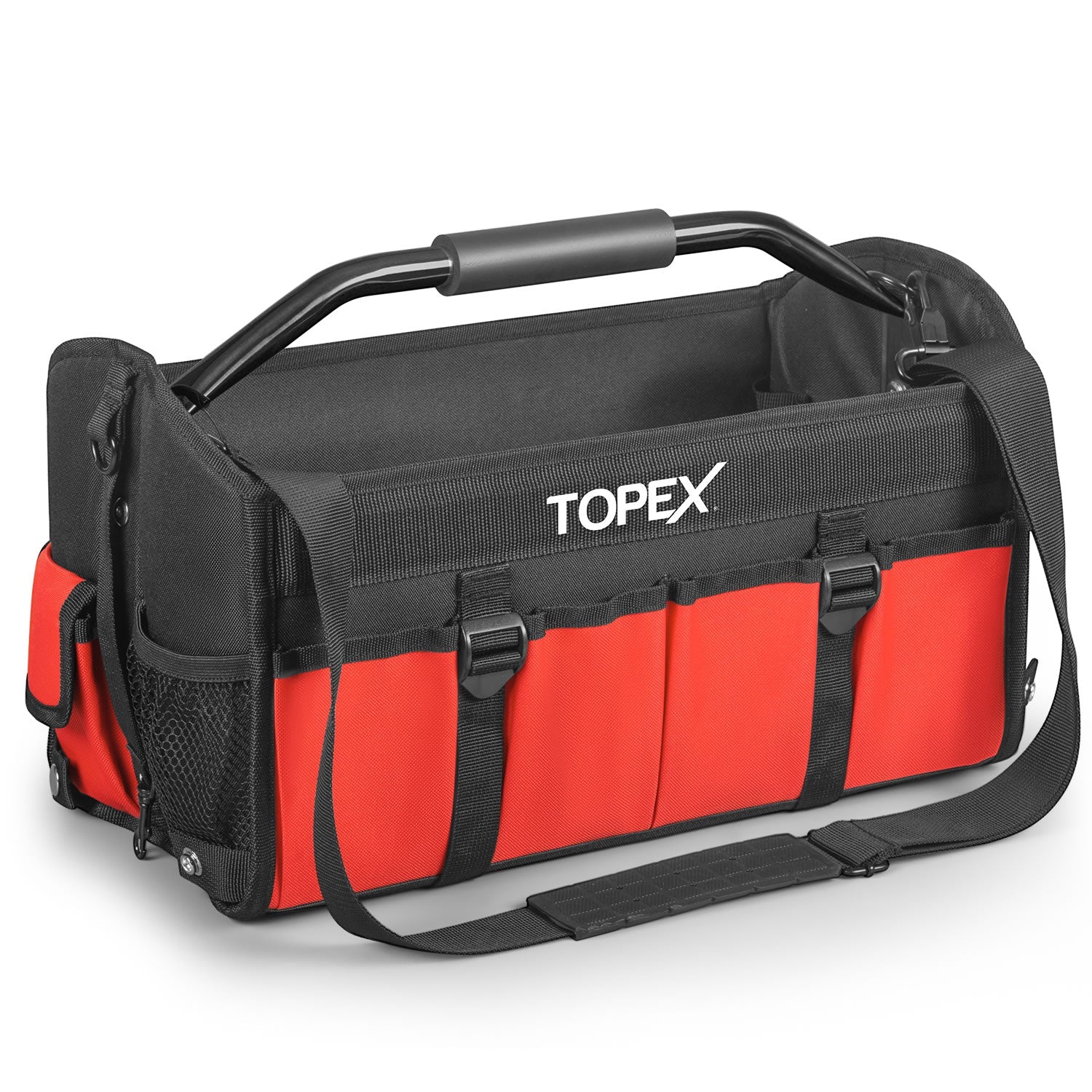 - [Convenient Open Top] Featuring a convenient open-top design, Topex tool bag allows the top to stay fully open when unzipped, providing easy and quick access to your tools.<>[Foldable Design] Features a foldable design for easy storage and portability, allowing the tool backpack to be compact when not in use.<>[Rotatable Steel Handle] The heavy-duty steel handle provides a strong, reliable grip and can rotate for added convenience, allowing you to carry the bag comfortably and easily wherever you go.<>[Adjustable Shoulder Strap] The padded ensures a comfortable fit for users of all sizes. It allows you to carry the bag hands-free, reducing strain on your arms and back during long workdays.<>[Multi Pockets] With 4 interior pockets and 12 exterior pockets, this tool bag keeps your tools organized and easily accessible, offering ample space for quick retrieval.