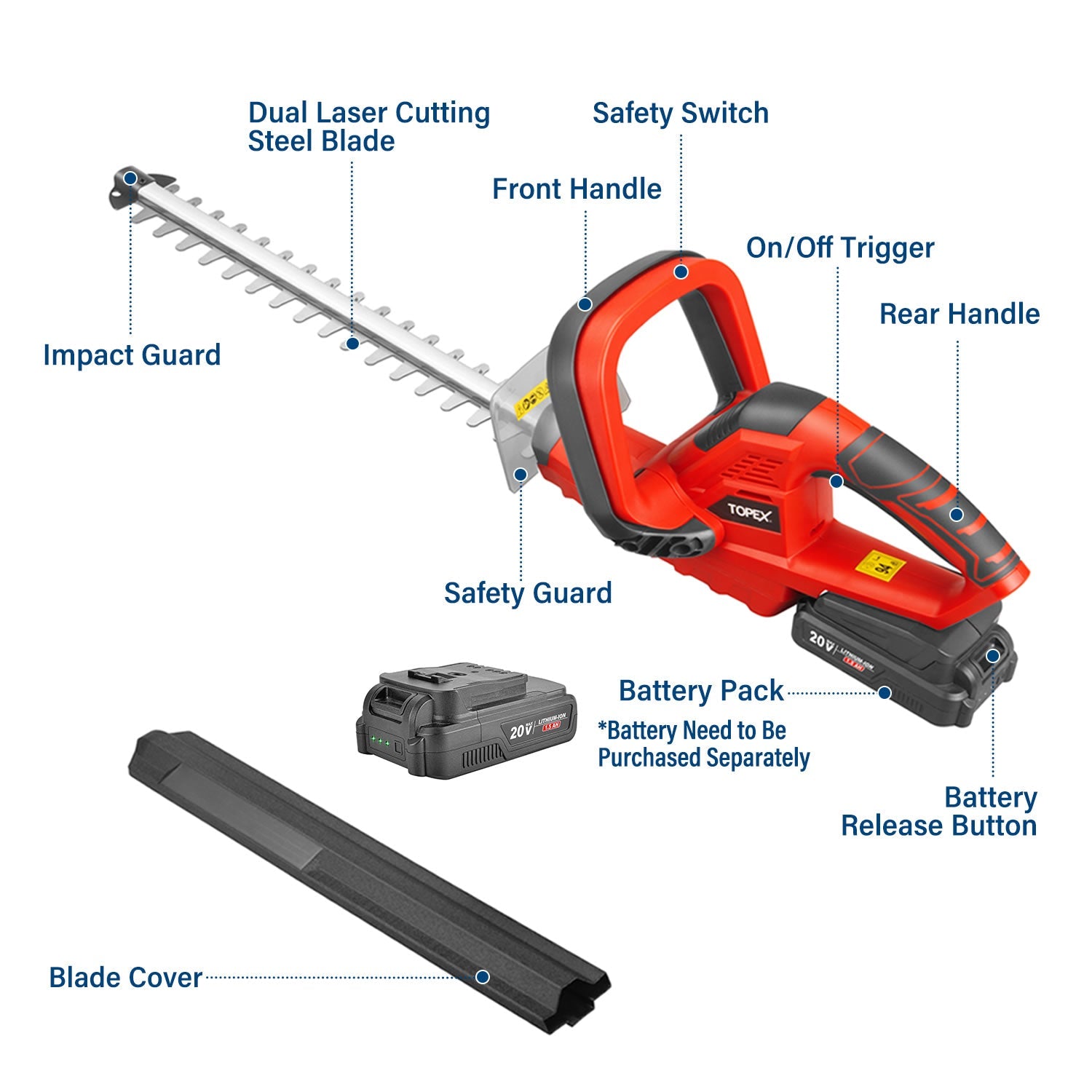 The TOPEX Cordless Hedge Trimmer is a portable and useful garden tool to help you trim hedges, bushes and shrubs. Its blade cuts branches quickly, while its compact design make the job easier on you. Double Impact Guard &Safety Guard design give you double safety protection. With less vibration and faster performance, you feel more comfortable and in control. Make projects fun again with easy-to-use and efficient devices to tackle jobs of all sizes. Home, garden, and yard maintenance have never been this effortless.
